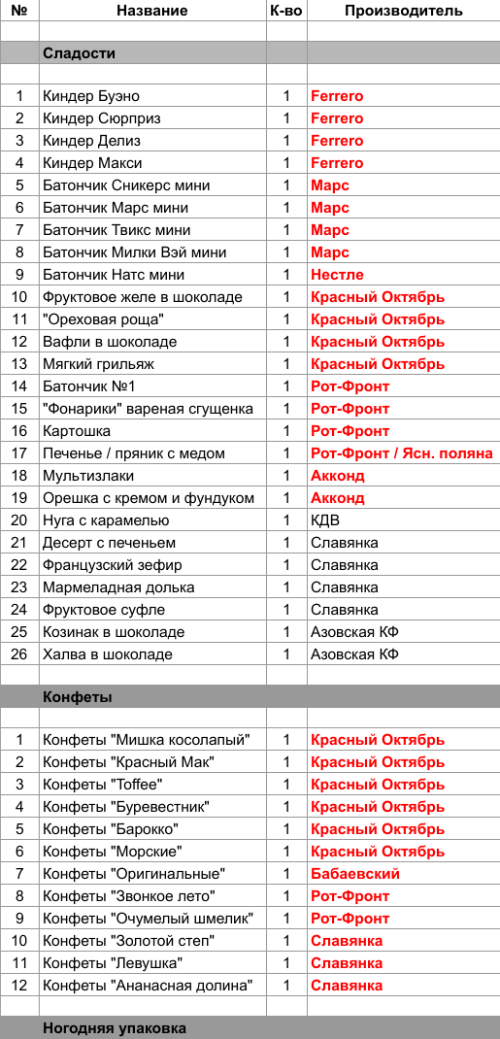 Батончик №1 (1 шт), "Фонарики" вареная сгущенка (1 шт), Картошка (1 шт), Печенье / пряник с медом (1 шт), Конфеты "Звонкое лето" (1 шт), Конфеты "Очумелый шмелик" (1 шт)
